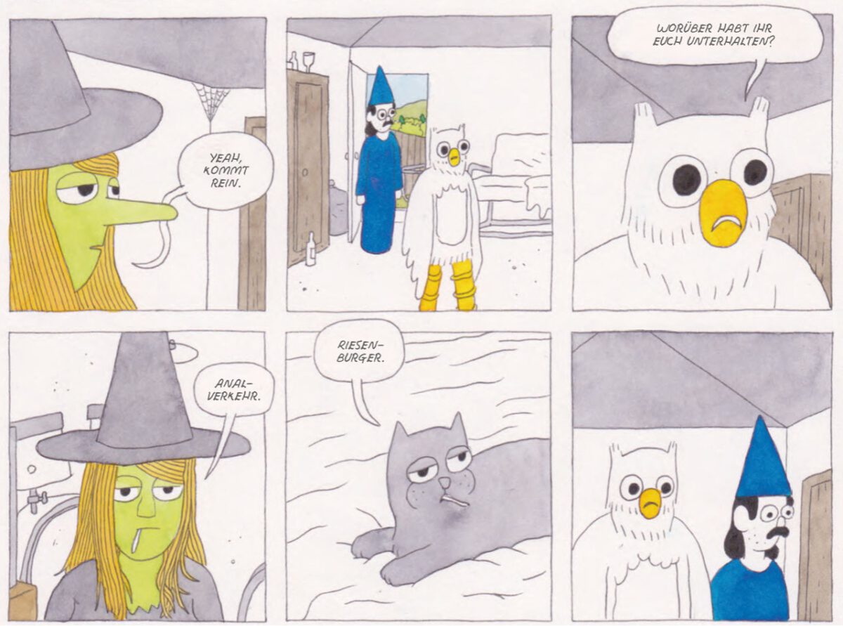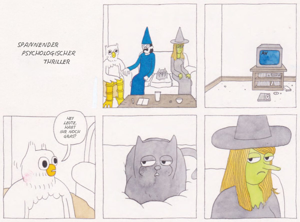 Und wenn Megg, Mogg und Eule nicht gestorben sind, dann… kann man sich bis heute fragen, inwiefern man hier überhaupt einen Hexen-Comic vor sich hat. Zugegeben: Megg trägt zwar die typische schwarze Kluft samt spitzem Hexenhut, und rote Haare und eine lange Nase hat sie auch. Doch im gesamten Band kommt ihre Hexistenz nur einmal zur Sprache: „Ich bin eine Hexe. Ich mache schaurige Sachen. Ich beschwöre Megaflüche. Ich schneide Schlampen.“ So weit, so unenthusiastisch. Und zaubern kann sie auch nicht. Der offensichtlichste Bezugspunkt ist die Kinderbuchreihe Meg and Mog von Helen Nicoll, wo es aber natürlich deutlich zurückhaltender zugeht. Und doch sind da kaum klar zu benennende Parallelen zwischen Megs simplen Abenteuern und Meggs Alltagsmuff, in dem je nach Geisteszustand schon das Einkaufen ein episches Unterfangen sein kann. Die Drogenexzesse passen zum Walpurgisnachtsthema, welches an anderen Stellen durch das Vorstadtszenario und Meggs Depression unterlaufen wird. Letzteres ist auch das eindrücklichste an Hexe Total und bildet so einen düsteren Referenzrahmen für all die geschmacklosen Scherze, unter denen vor allem Eule zu leiden hat. Irgendwie ist das dann auch hexenmäßig: wenn man sich so mies fühlt wie Megg in einer Welt, aus der man nicht fliehen kann, dann darf sich man vielleicht zurecht wie verhext zwischen Normalos fühlen – und das entweder an diesen Normalos auslassen oder sich Hexenkräfte wünschen, um wegzufliegen.
