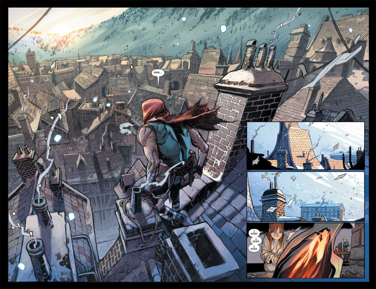 Die Zeichnungen dazu stammen aus der Feder des gerade mal 23 Jahre jungen Dan Mora, der trotz seiner Jugend mit HEXED, BUFFY und – ganz aktuell – ONCE AND FUTURE schon einige bemerkenswerte Werke abgeliefert hat und am Anfang einer vielversprechenden und hoffentlich noch langen Karriere steht. Mora stammt übrigens aus dem tropischen Costa Rica – was vielleicht erklärt, warum unser Titelheld trotz Eis und Schnee immer mit nackten Oberarmen herumläuft. Aber vermutlich ist da auch ein gewisser Testesteron-Überschuss im Spiel und all das hat seine Richtigkeit. Doch von solchen kleinkrämerischen Details einmal abgesehen sind die Zeichnungen ausgesprochen wirkungsvoll, nicht zuletzt durch ihre detaillierte Ausarbeitung und die kräftige, stimmungsvolle Kolorierung.
