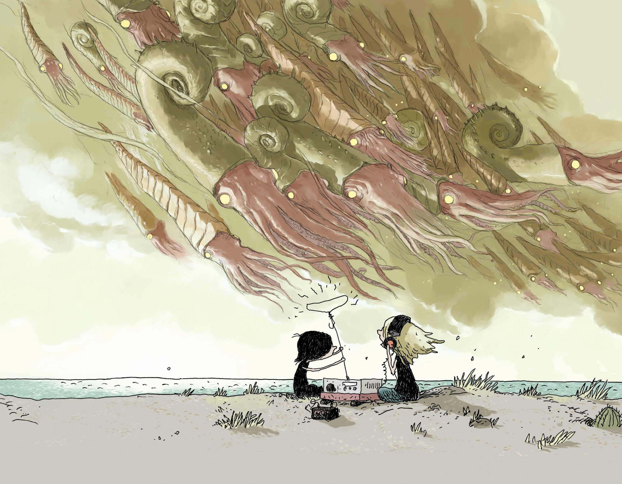 Neben den einmaligen Geschichten pflegt er allerdings auch einen unverkennbaren Stil, der sofort ins Auge springt. Gerne paart er große Köpfe mit dünnen, schlaksigen Körpern und seine Szenarien scheinen voll gestopft zu sein mit unnatürlichen Formen. Man fühlt sich dabei immer leicht an Stilmittel des frühen Tim Burton erinnert. Das i-Tüpfelchen ist seine eigene Aquarell-Kolorierung, über die er seine feinen Striche abrundet und final ausgestaltet. Vor allem seine surrealen Elemente stellt er so gekonnt ins Scheinwerferlicht.